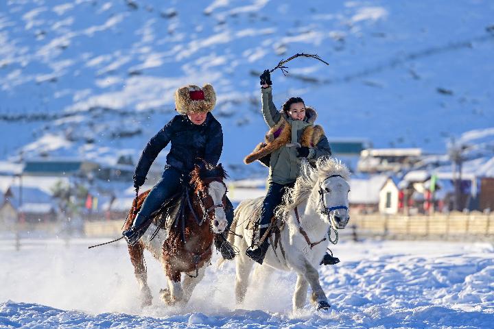 12月22日,在新疆阿勒泰地區(qū)富蘊縣可可托海鎮(zhèn)塔拉特村,村民為游客表演“姑娘追”。新華社記者丁磊 攝