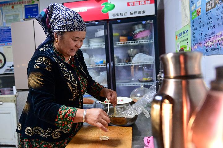 12月22日,在新疆阿勒泰地區(qū)富蘊縣可可托海鎮(zhèn)塔拉特村,村民在自家民宿內為游客準備晚餐。新華社記者丁磊 攝