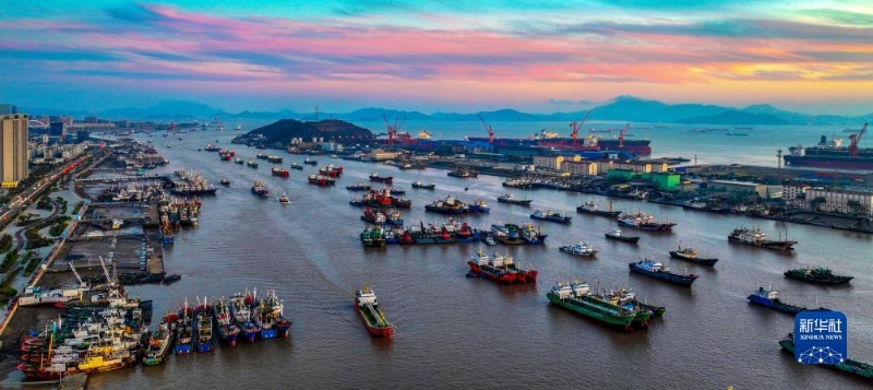 12月14日,浙江省舟山市普陀區(qū)沈家門漁港在落日余暉映照下美如畫卷(無人機照片)。