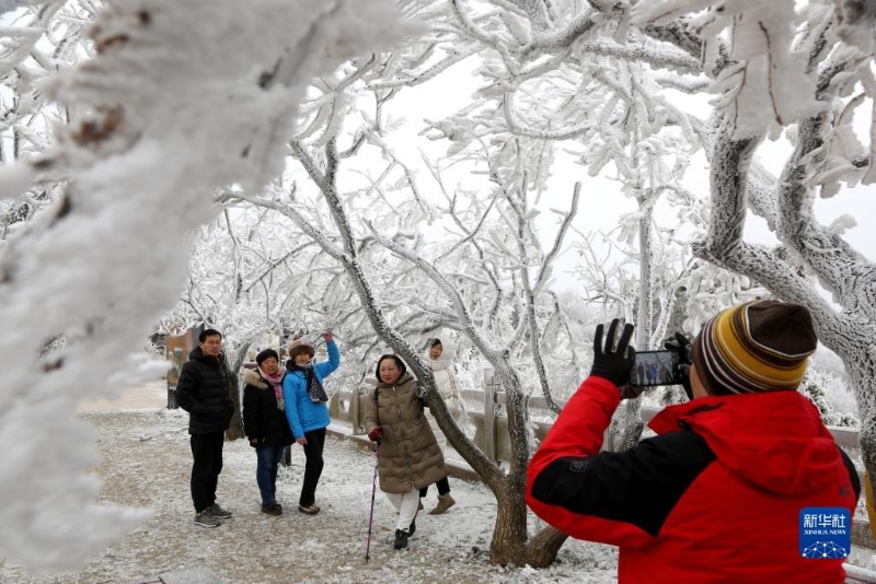 12月12日,游人在江蘇省連云港市花果山玉女峰景點霧凇美景中拍照留影。