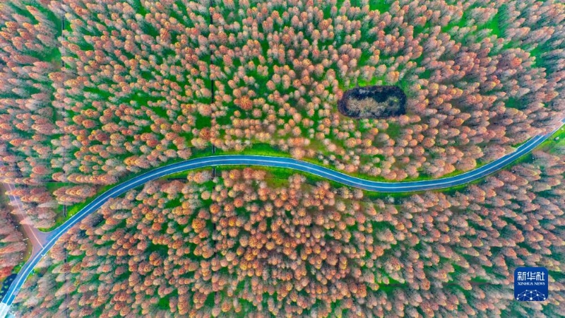 12月13日在湖南省資興市東江灣城市公園拍攝的水杉美景(無人機照片)。