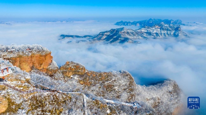 12月12日在河南省濟源市拍攝的雪后王屋山美景(無人機照片)。