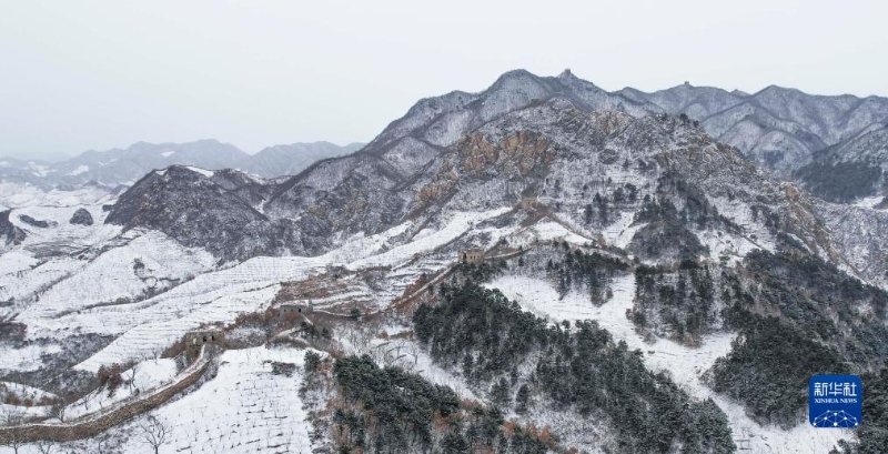 12月14日在河北省遷西縣拍攝的古長城雪景(無人機照片)。