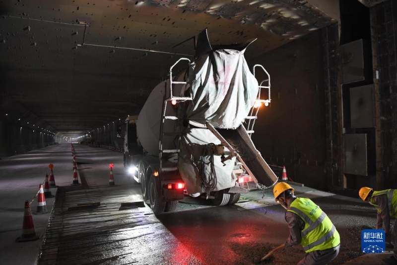 11月28日,工人在深中通道海底沉管隧道內(nèi)進行最后的壓艙混凝土澆筑。