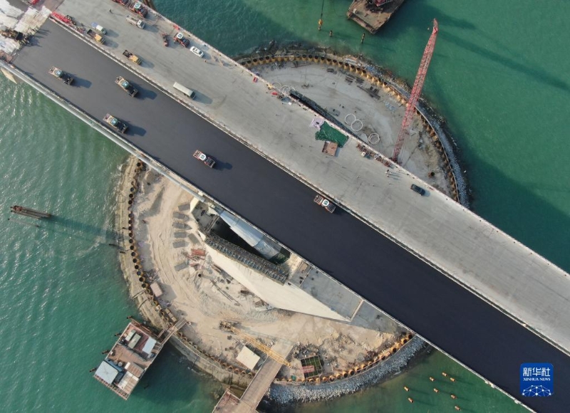 11月27日,保利長大工人在深中通道伶仃洋大橋進行路面鋪裝工作(無人機照片)。