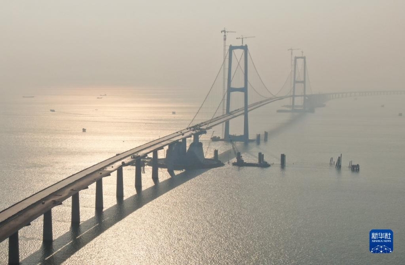 這是11月28日拍攝的深中通道伶仃洋大橋東塔及西人工島(無人機照片)。