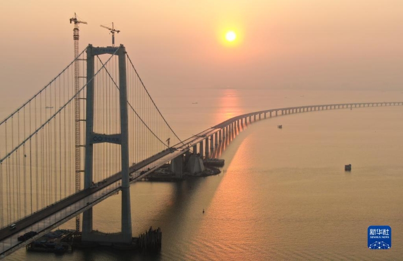 這是夕陽下的深中通道伶仃洋大橋(11月27日攝,無人機照片)。