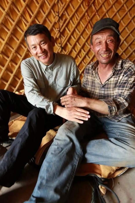在蒙古包中與當(dāng)?shù)啬撩衽收劦牧_新。受訪者供圖