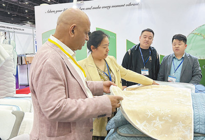 在家紡展區(qū),中企帶來的凝膠睡眠產(chǎn)品吸引了不少客商的目光。他們紛紛向企業(yè)負(fù)責(zé)人詳細(xì)了解產(chǎn)品原料和性能特點,表達出與中國同行的合作意愿?!拔业墓S使用了很多中國設(shè)備和中國原材料?!币幻麃碜园<暗目蜕瘫硎荆M谡箷险业礁鄡?yōu)質(zhì)原材料,也期待在母嬰用品行業(yè)發(fā)現(xiàn)新的商機。他說:“在中東地區(qū),從日常生活到工業(yè)生產(chǎn)的很多產(chǎn)品都來自中國。中國可靠的供貨渠道,為維護全球產(chǎn)業(yè)鏈供應(yīng)鏈穩(wěn)定作出重要貢獻。”