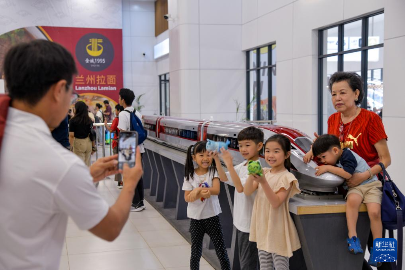 12月25日,乘客在印度尼西亞雅加達(dá)的哈利姆車站候車大廳與雅萬高鐵高速動車組模型合影。