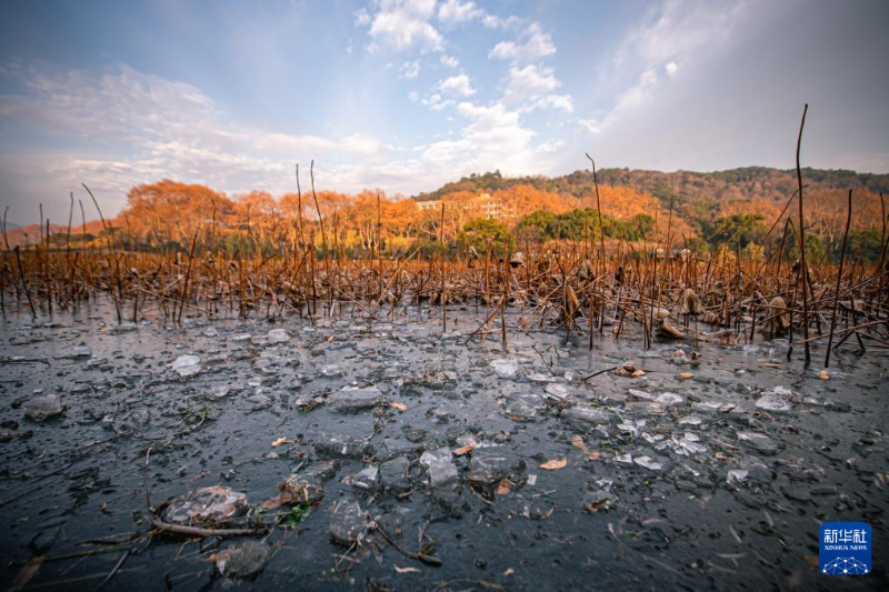 冬日,杭州西湖部分水域水面結(jié)冰,冰面、殘荷與朝陽(yáng)共同構(gòu)成美麗畫(huà)卷。
