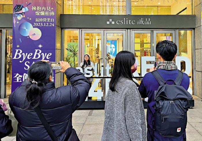 圖:12月24日,位于臺北市的誠品信義店最后一日營業(yè),吸引民眾前來購書購物、打卡留念。圖為民眾在書店門口拍照留念。\中新社
