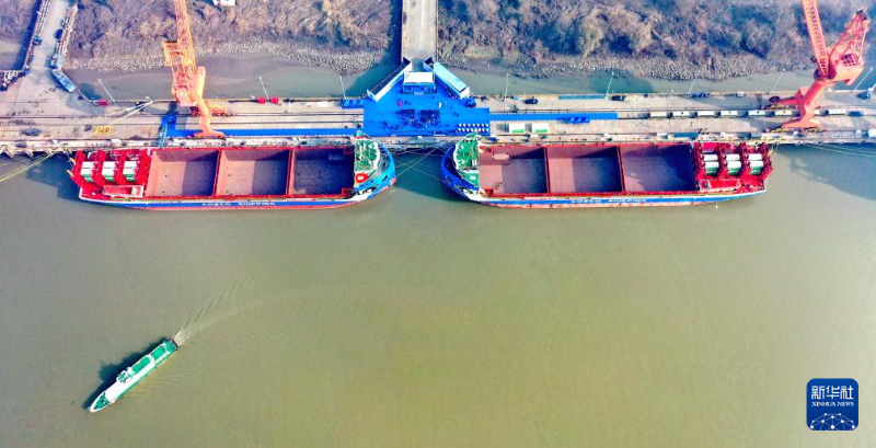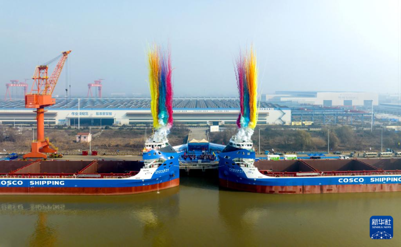 12月28日拍攝的國產(chǎn)萬噸級(jí)電動(dòng)集裝箱船“中遠(yuǎn)海運(yùn)綠水01”(左)、“中遠(yuǎn)海運(yùn)綠水02”(無人機(jī)照片)。