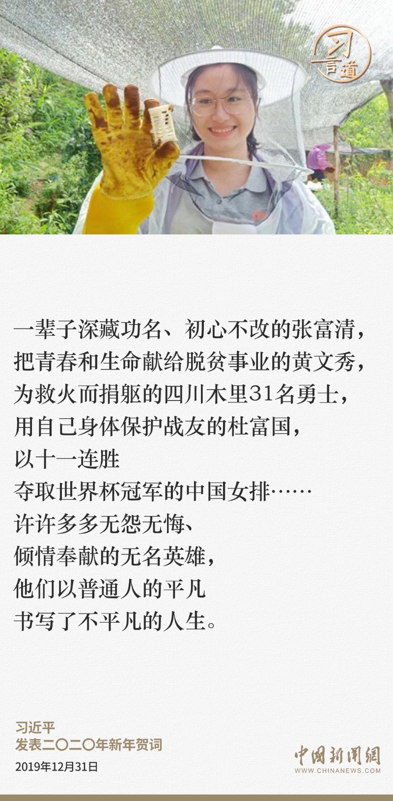 平凡鑄就偉大,英雄來自人民。自2013年歲末起,國家主席習(xí)近平連續(xù)10年發(fā)表新年賀詞。在新年賀詞中,習(xí)近平總會為奮斗的中國人點贊、加油鼓勁,勉勵大家“征途漫漫,惟有奮斗”。