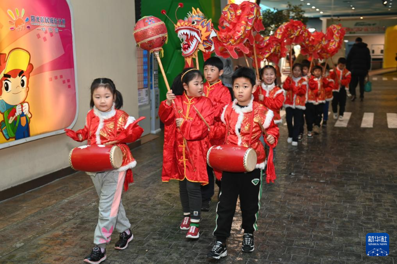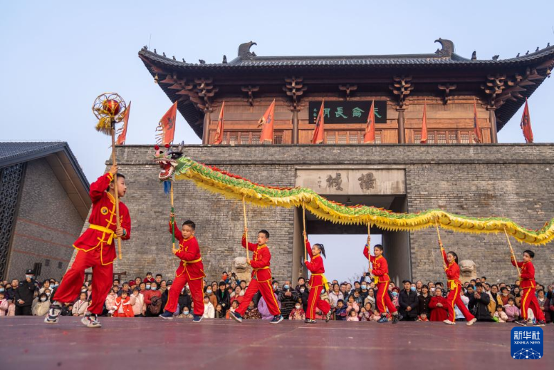 ??12月30日,在安徽省合肥市肥東縣撮街,小朋友在表演舞龍。