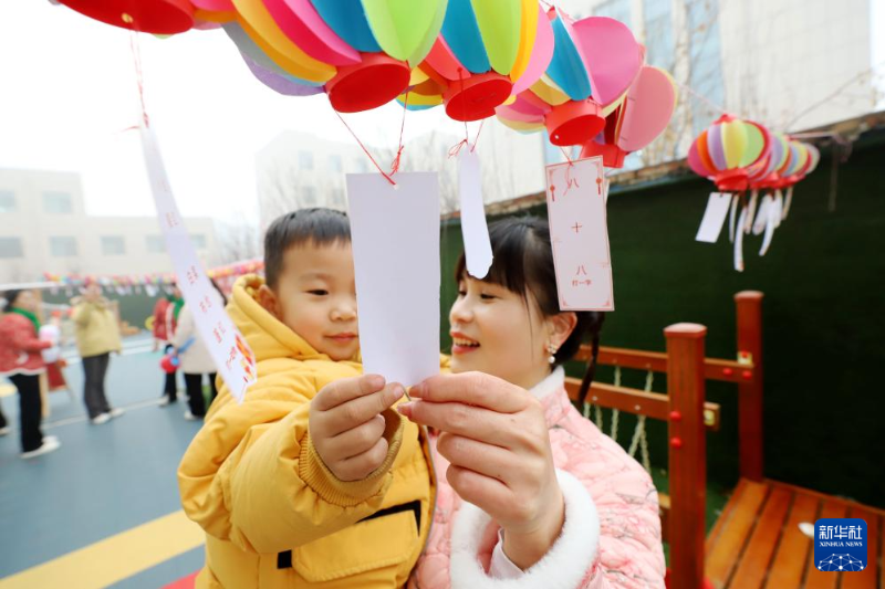 ??12月30日,在山東省濱州市惠民縣一所幼兒園,小朋友和家長(zhǎng)一起猜燈謎。