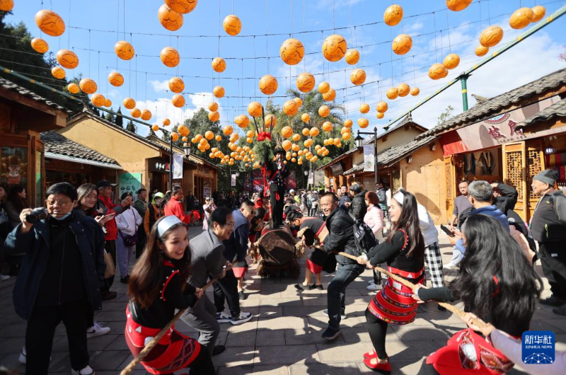 ??12月30日,在云南省昆明市云南民族村,游客與佤族演員一起體驗(yàn)拉木鼓。