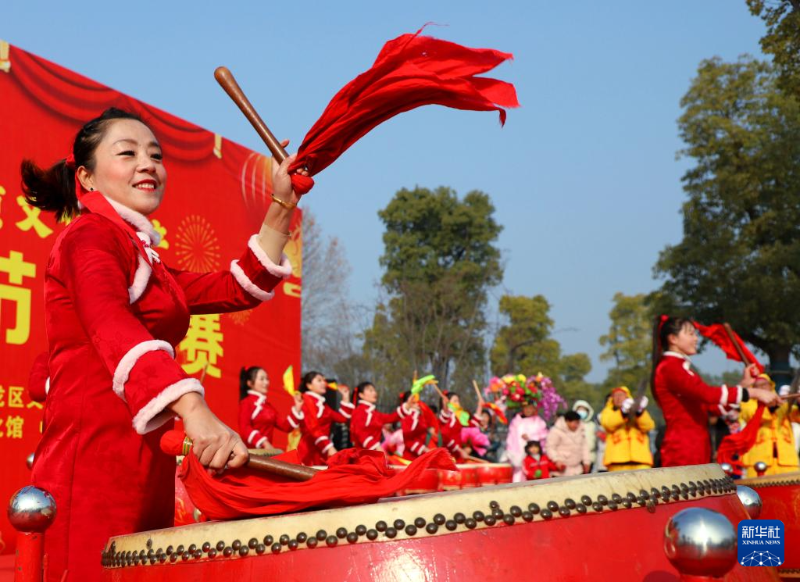 ??12月30日,在河南省南陽市中國月季園,演員在表演打鼓。