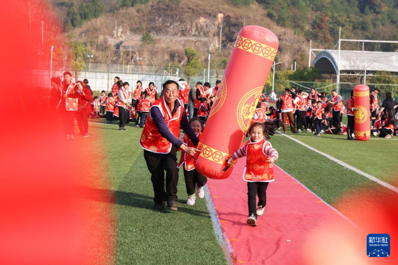 ??12月30日,家長(zhǎng)和小朋友在貴州省黔東南苗族侗族自治州岑鞏縣一所幼兒園參加迎新年趣味活動(dòng)。