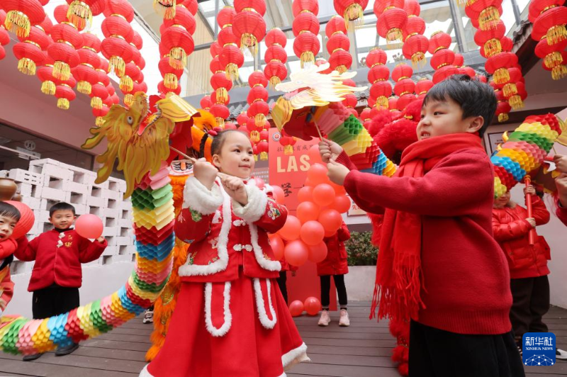 ??12月30日,在浙江省湖州市德清縣雷甸鎮(zhèn)社區(qū)教育中心,小朋友在表演手工制作的紙龍。