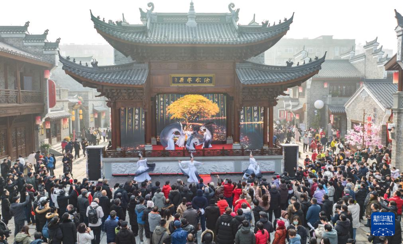 ??12月30日,游人在湖北省襄陽市古城內(nèi)的管家巷文化休閑街區(qū)觀看演出(無人機(jī)照片)。