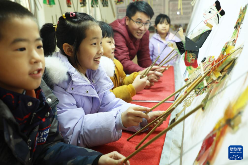 ??12月30日,在河北省唐山市豐潤(rùn)區(qū)太平路街道錦祥社區(qū),皮影藝人指導(dǎo)小朋友表演皮影戲。