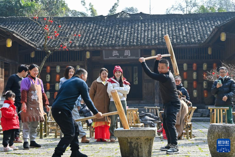 ??12月30日,游人在重慶市酉陽土家族苗族自治縣桃花源景區(qū)體驗(yàn)打糍粑。