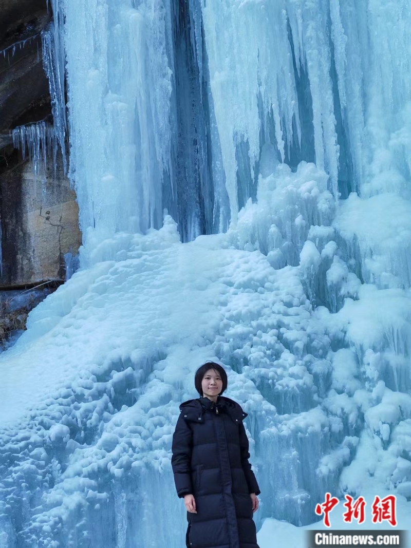 圖為北京大學(xué)臺(tái)灣交換生謝茵在密云的冰瀑前留念。(受訪者供圖)