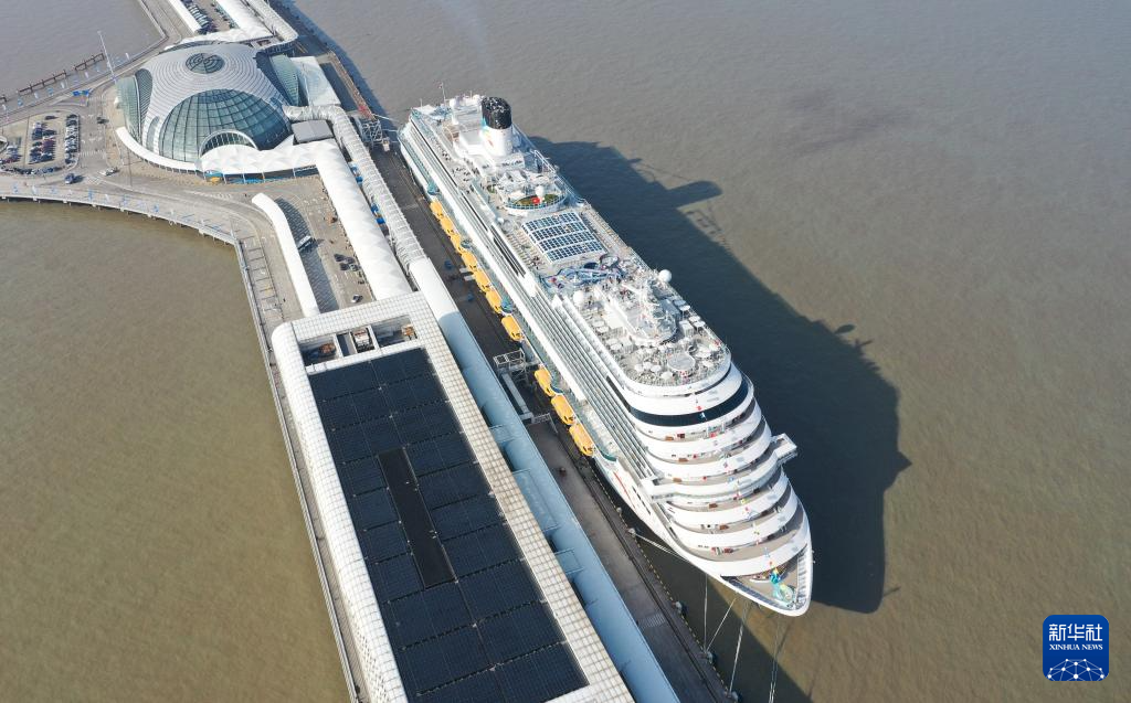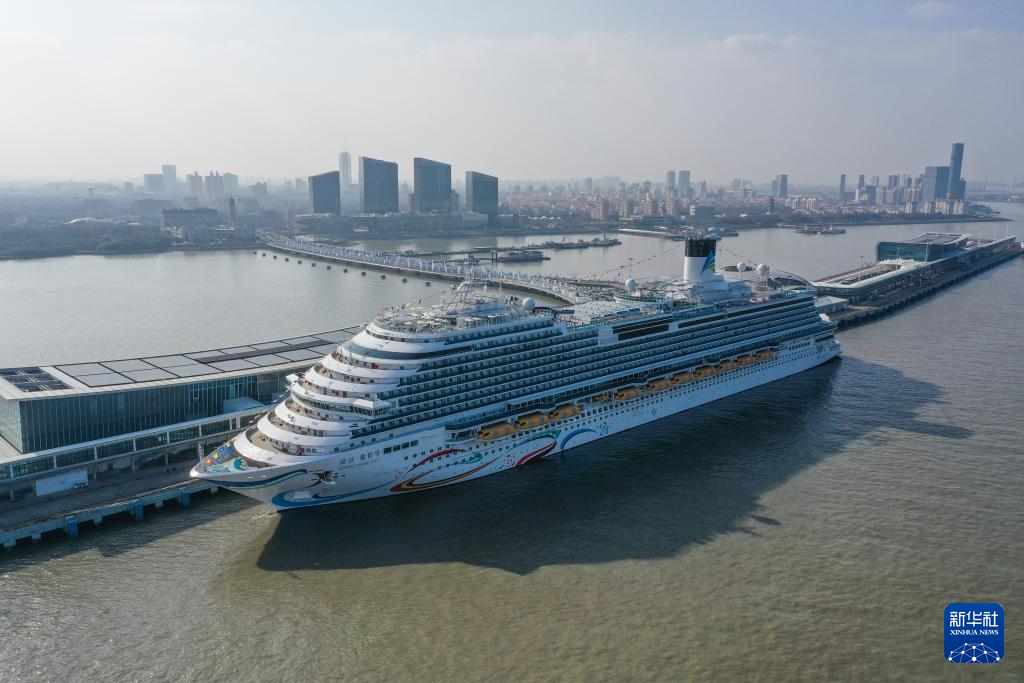 1月1日,“愛(ài)達(dá)·魔都號(hào)”停靠在上海吳淞口國(guó)際郵輪港(無(wú)人機(jī)照片)。新華社記者 丁汀 攝