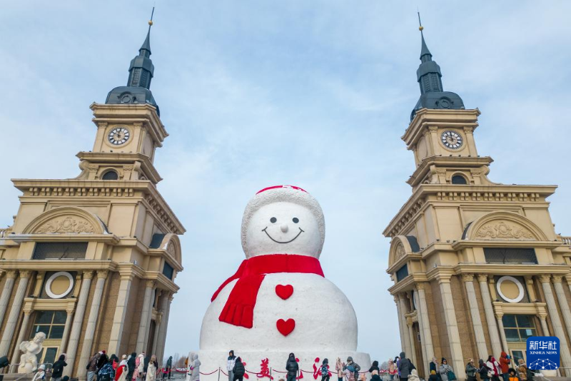 1月1日,在哈爾濱市群力音樂公園,眾多游客前來與雪人合影(無人機照片)。