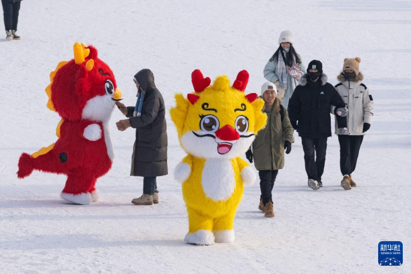 1月1日,在哈爾濱太陽島雪博會園區(qū),工作人員與游客互動。