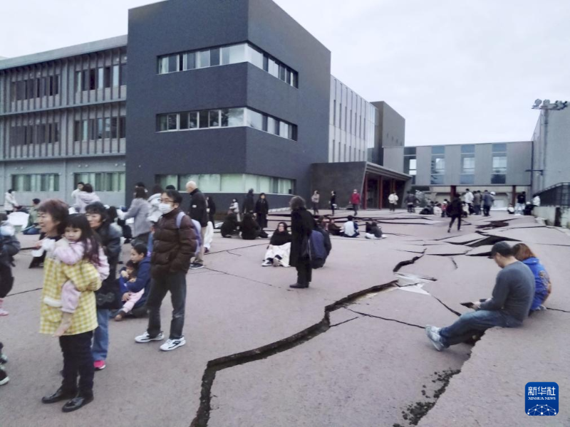 1月1日,在日本石川縣輪島市,人們站在被地震破壞的地面上。新華社/共同社