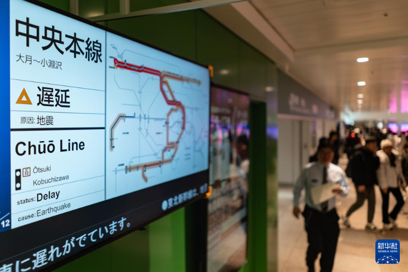 1月1日,在日本東京新宿車站,列車運營時刻表顯示列車因地震延誤。新華社記者 張笑宇 攝