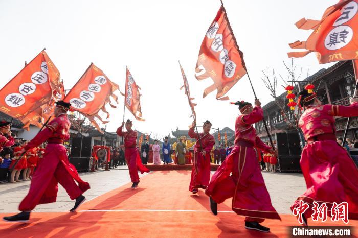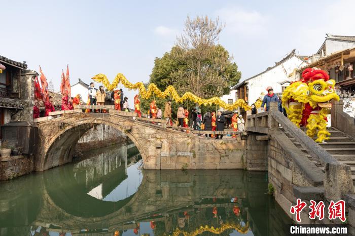 1月1日上午,江蘇周莊古鎮(zhèn)舉行了傳統(tǒng)的開莊大典。在挑花籃、打連廂、蕩湖船等民俗表演的節(jié)慶氛圍中,古鎮(zhèn)“串龍舞獅跳加官,鳴鑼開莊接福運(yùn)”的傳統(tǒng)民俗場(chǎng)景再現(xiàn)。莊主身著彩袍,在丫鬟、家丁的簇?fù)硐?,點(diǎn)蠟焚香,頌文祈福,祈求一年國(guó)泰民安、風(fēng)調(diào)雨順、谷物豐收。宣畢,鞭炮齊鳴,莊主鳴鑼開莊,隨后由莊主、掌禮、家丁丫鬟組成的巡游隊(duì)伍進(jìn)入古鎮(zhèn)巡游,沿途向賓客賀新年,喜氣洋洋,其樂(lè)融融。