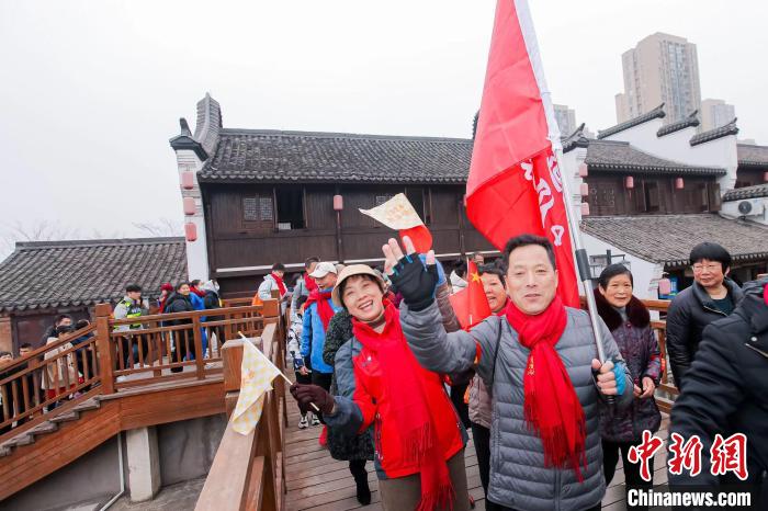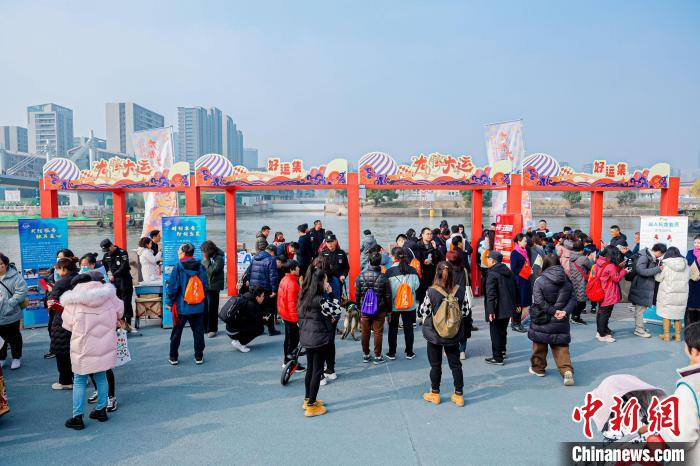 中新網(wǎng)杭州1月1日電 (童笑雨)一元今復始,祈福萬象新。2024年1月1日,2024中國(杭州)新年祈福走運大會暨拱墅區(qū)第18屆“新年走運·寶積祈?!苯∽呋顒釉诰┖即筮\河南端浙江杭州開啟,市民游客陸續(xù)前來,“走運”祈福健身,打卡大運河世界文化遺產(chǎn)。