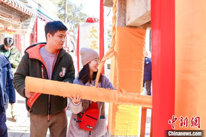 一對游客在青島嶗山風(fēng)景名勝區(qū)通過敲鐘鳴曉祈福新年。趙斌 攝