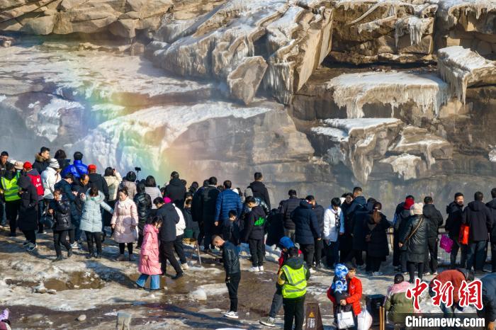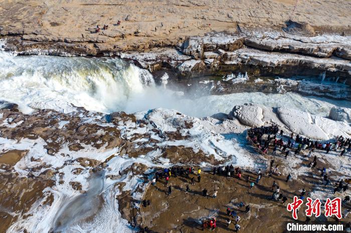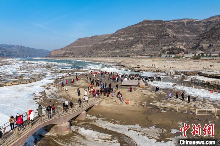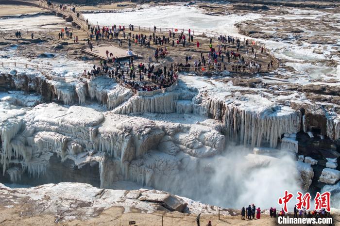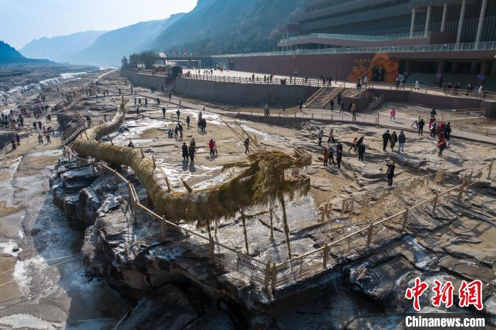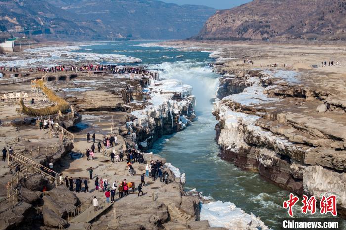 冬季的黃河壺口瀑布,河水滔滔,奔流不息,氣勢(shì)磅礴。此時(shí)瀑布水色由黃轉(zhuǎn)為翠綠,拍擊河岸,激起層層浪花,白霧躍然升騰,在兩岸石壁上掛起了晶瑩剔透的冰掛,吸引眾多游客前往觀賞。元旦假期,當(dāng)?shù)孛袼姿嚾松碇⒀b,表演非遺民俗,在黃河岸邊打起壺口斗鼓,迎八方游客。