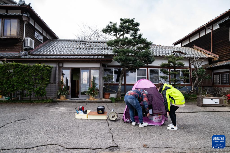 1月2日,在日本石川縣羽咋郡,受災(zāi)住戶往帳篷搬運物資。