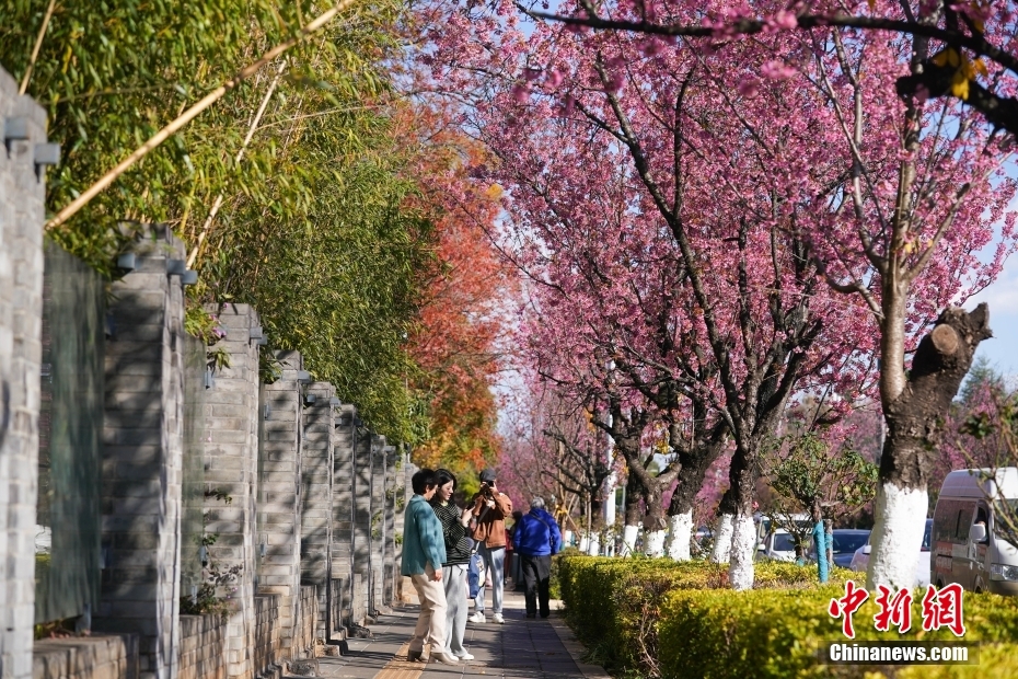 1月2日,街頭盛開的冬櫻花。近日,云南昆明冬櫻花盛開,勾勒出獨屬“春城”的冬日畫卷。中新社記者 劉冉陽 攝