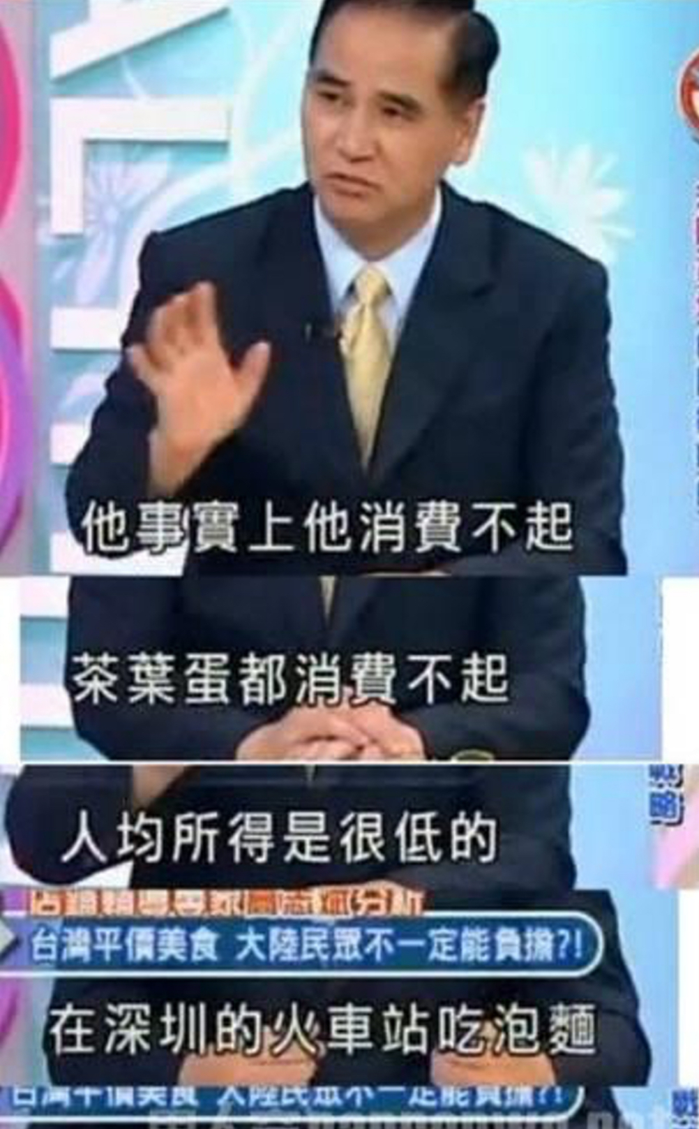 在邱敏寬放言“大陸因為經(jīng)濟不景氣把五糧液喝漲價”之前,臺灣政論節(jié)目中還出現(xiàn)過“大陸人吃不起茶葉蛋和榨菜”等無稽之談。2011年,在臺灣某電視臺播出的一期綜藝節(jié)目中,主持人與嘉賓談論在大陸的經(jīng)歷和對大陸的印象。臺北美食學院教授高志斌聲稱,大陸百姓收入低,消費不起茶葉蛋,引來眾多網(wǎng)友嘲諷。
