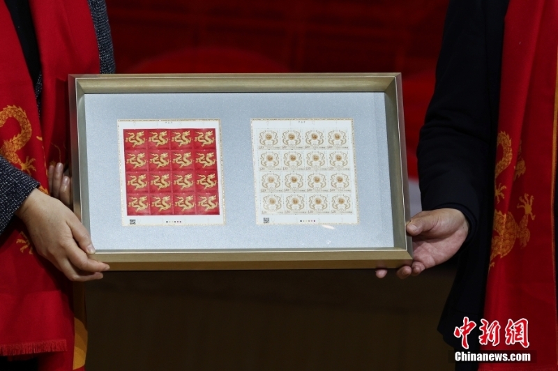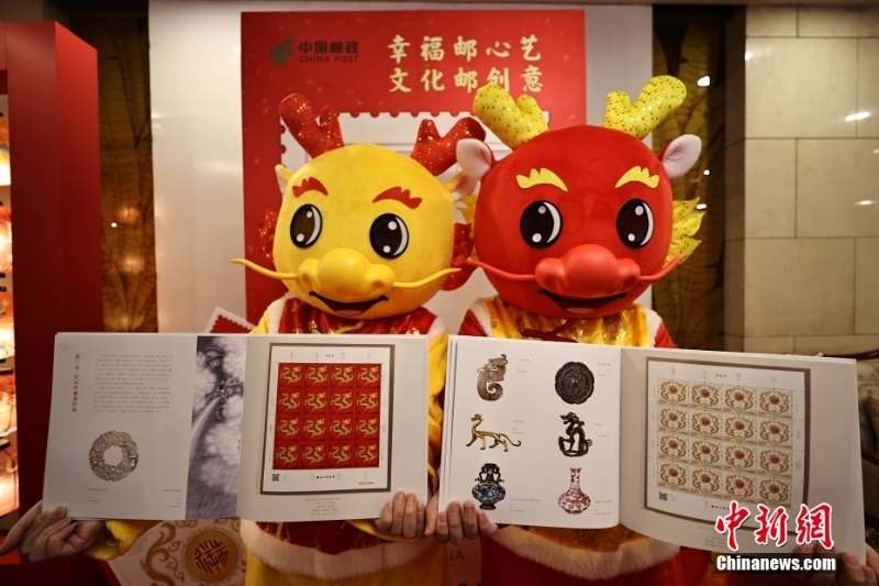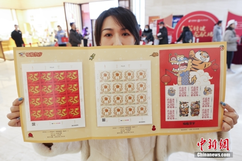 1月5日,南京郵政舉辦“天龍行健 辰龍獻瑞”《甲辰年》特種郵票首發(fā)儀式。當(dāng)日,中國郵政發(fā)行《甲辰年》特種郵票,該郵票一套2枚,圖案名稱分別為“天龍行健”和“辰龍獻瑞”,全套郵票面值為2.40元,計劃發(fā)行數(shù)量為2998萬套。中新社記者 泱波 攝