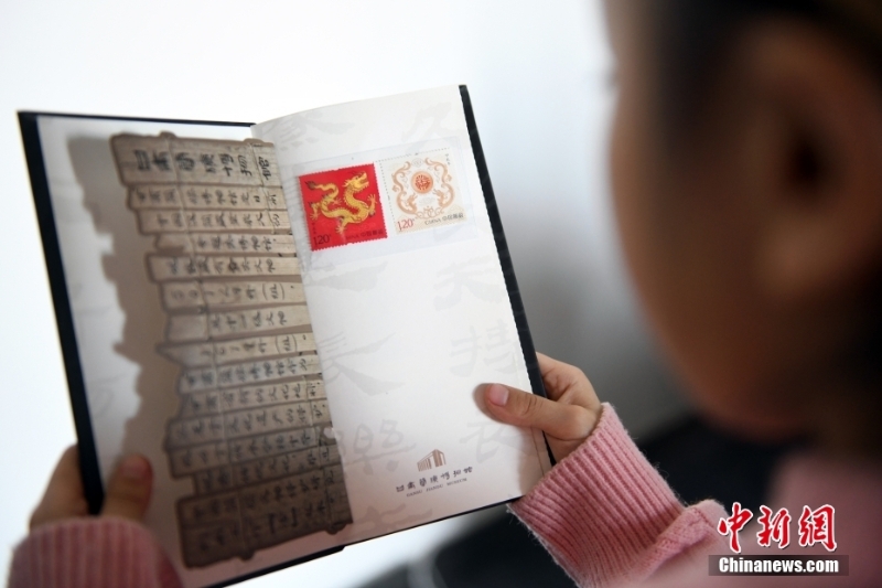1月5日,甘肅蘭州,小朋友觀看甘肅簡牘博物館與中國郵政蘭州市分公司聯(lián)合推出的《甲辰年》特種郵票明信片。當(dāng)日,中國郵政發(fā)行《甲辰年》特種郵票一套2枚,郵票圖案名稱分別為“天龍行健”、“辰龍獻瑞”。中新社記者 戴文昌 攝