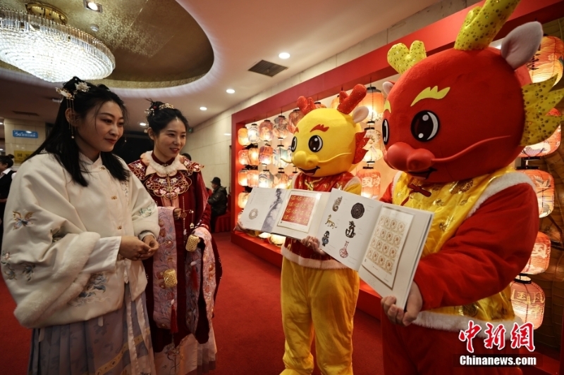 1月5日,山西太原,工作人員身著龍形公仔服展示《甲辰年》特種郵票。當(dāng)日,中國郵政發(fā)行的《甲辰年》特種郵票開售。郵票圖案名稱分別為“天龍行健”、“辰龍獻瑞”。全套郵票面值為2.40元人民幣。中新社記者 張云 攝