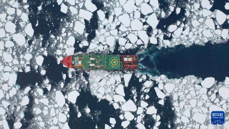 北京時間1月6日,執(zhí)行中國第40次南極考察任務的“雪龍2”號在阿蒙森海為潛標布放開辟水道(無人機照片)。新華社發(fā)(陳棟彬 攝)