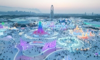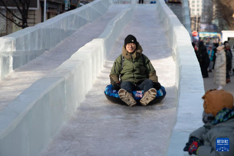 1月8日,游客在哈爾濱市道外區(qū)中華巴洛克歷史文化街區(qū)內(nèi)玩冰滑梯。