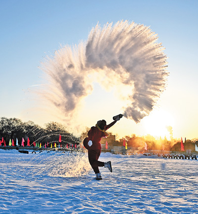 游客在沈陽一家公園里體驗“潑水成冰”的樂趣。