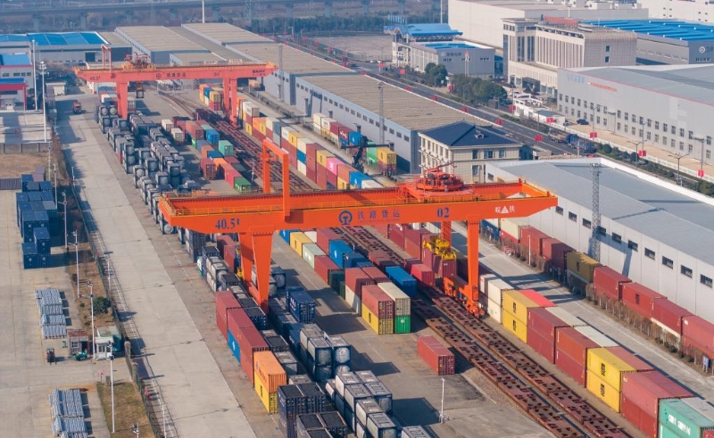 2023年12月25日,在中國鐵路上海局集團有限公司海安物流基地,集裝箱門吊進行集裝箱裝運作業(yè)。新華社發(fā)(翟慧勇攝)