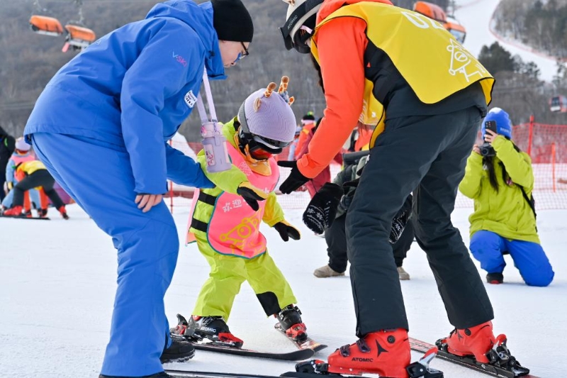 1月8日,滑雪教練在吉林市萬科松花湖度假區(qū)教來自廣西南寧的“砂糖橘”小朋友滑雪。新華社記者顏麟蘊 攝