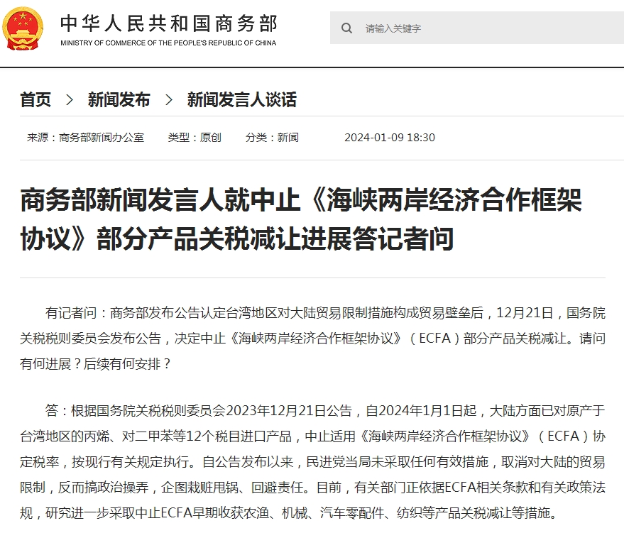 【華夏經(jīng)緯網(wǎng)綜合報(bào)道】1月9日,商務(wù)部新聞發(fā)言人表示,臺(tái)灣地區(qū)對大陸貿(mào)易限制措施構(gòu)成貿(mào)易壁壘,2023年12月21日發(fā)布公告決定中止《海峽兩岸經(jīng)濟(jì)合作框架協(xié)議》(ECFA)部分產(chǎn)品關(guān)稅減讓,根據(jù)該公告,自2024年1月1日起,大陸已對原產(chǎn)于臺(tái)灣地區(qū)的丙烯、對二甲苯等12個(gè)稅目進(jìn)口產(chǎn)品,中止適用ECFA協(xié)定稅率,按現(xiàn)行有關(guān)規(guī)定執(zhí)行。但自公告發(fā)布以來,民進(jìn)黨當(dāng)局未采取任何有效措施,取消對大陸的貿(mào)易限制,反而搞政治操弄,企圖栽贓甩鍋、回避責(zé)任。目前,有關(guān)部門正依據(jù)ECFA相關(guān)條款和有關(guān)政策法規(guī),研究進(jìn)一步采取中止ECFA早期收獲農(nóng)漁、機(jī)械、汽車零配件、紡織等產(chǎn)品關(guān)稅減讓等措施。