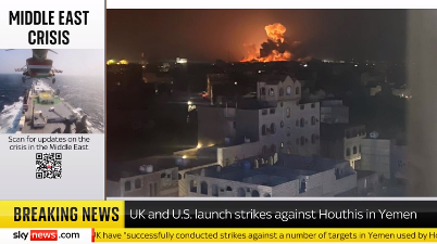 英國(guó)天空電視臺(tái)援引社交媒體視頻報(bào)道“美英11日對(duì)也門胡塞武裝目標(biāo)發(fā)動(dòng)空襲” 視頻截圖